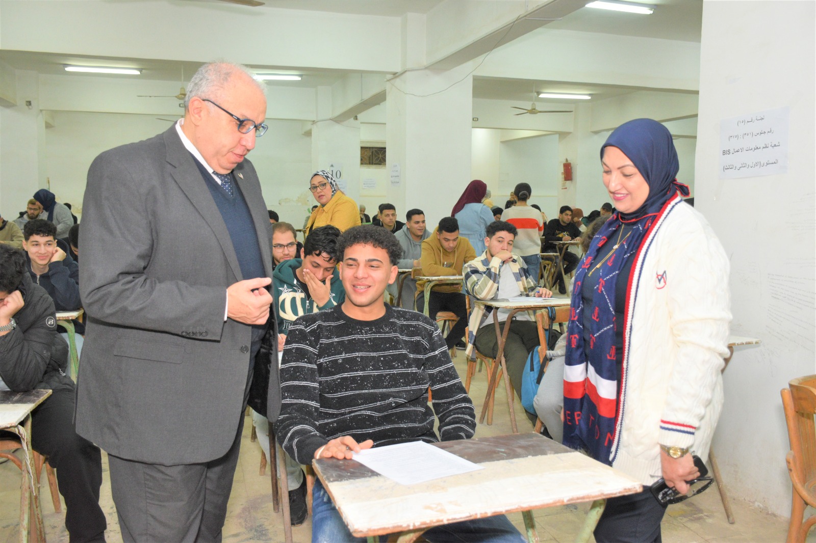 During his tour at the halls and committees, Faculty Dean ensured that the examination process was proceeding smoothly. He was keen to listen to students to make sure that all means of comfort and a calm environment were provided inside the exam halls, ensuring they could take their exams in an ideal setting.