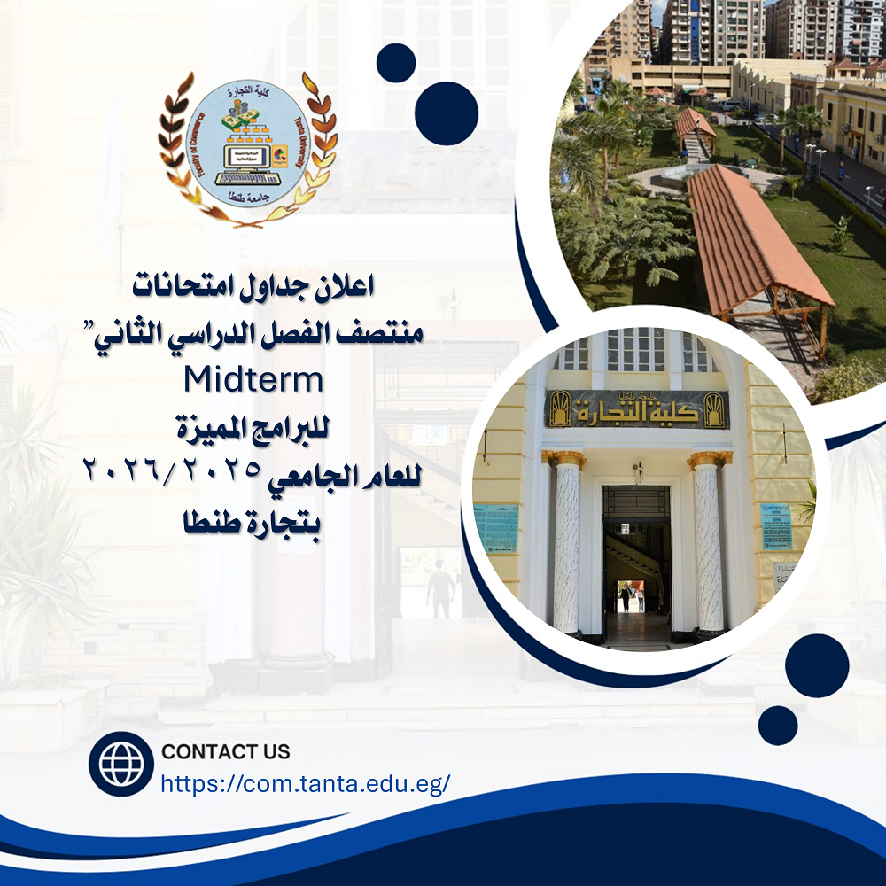 اعلان جداول امتحانات منتصف الفصل الدراسي الثاني"Midterm” للبرامج المميزة للعام الجامعي ٢٠٢٥ /٢٠٢٦ بتجارة طنطا