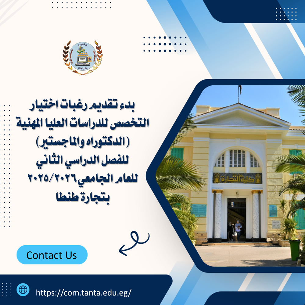 تعلن ادارة الدراسات العليا بكلية التجارة جامعة طنطا عن بدء تقديم رغبات اختيار التخصص بالمستويات الحالية بالدراسات العليا المهنية، للدراسة بالفصل الدراسي الثاني للعام الجامعي 2026/2025