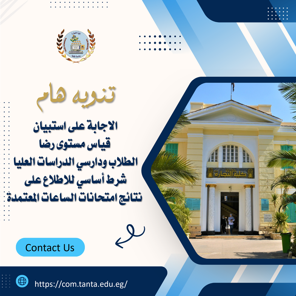 تنوه إدارة كلية التجارة جامعة طنطا أنه تيسيراً لإجراءات إعلان النتائج، يتوجب على جميع الطلاب ودارسي الدراسات العليا بنظام الساعات المعتمدة ضرورة الدخول على المنصة الإلكترونية و الإجابة على الاستبيان الخاص بـ (قياس مستوى رضا الطلاب عن أداء أعضاء هيئة التدريس والمقررات الدراسية)قبل اعلان النتائج.