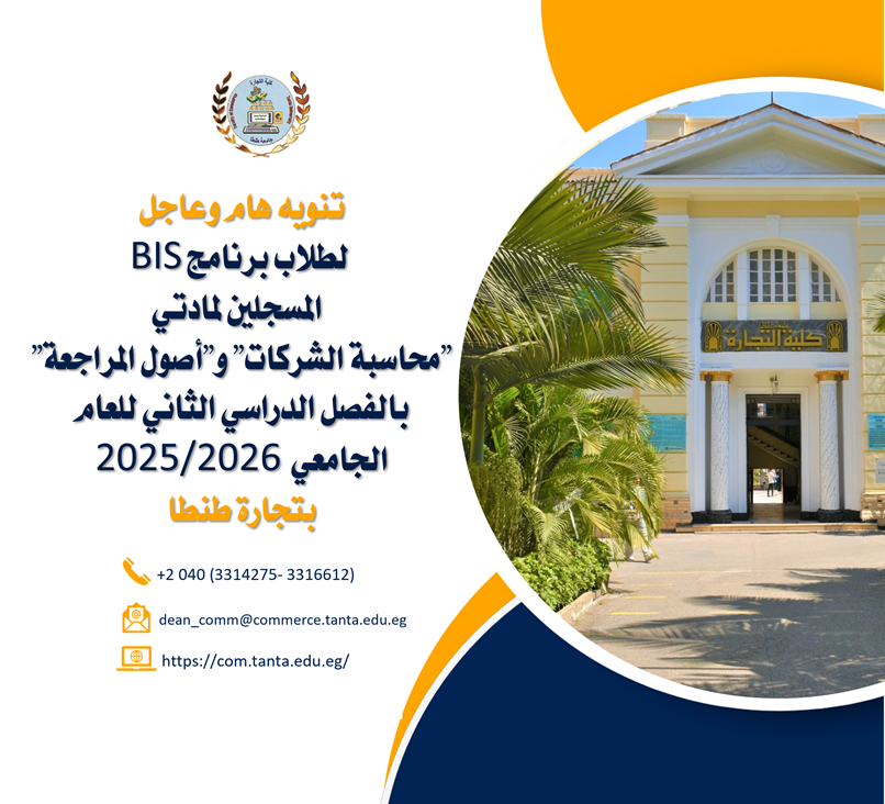 تنويه هام وعاجل لطلاب برنامج (BIS) المسجلين لمادتي "محاسبة الشركات" و"أصول المراجعة" بالفصل الدراسي الثاني للعام الجامعي ٢٠٢٥ /٢٠٢٦
