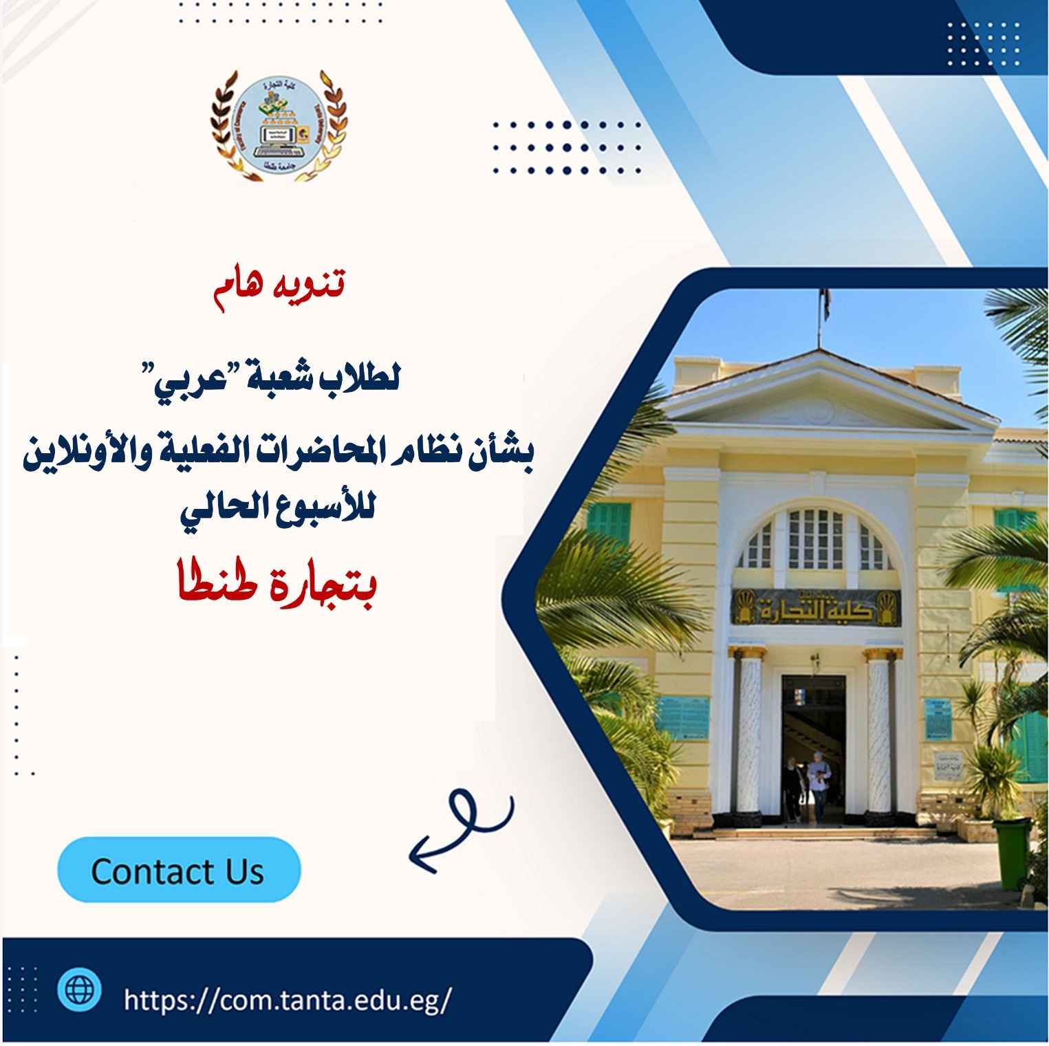 تعلن إدارة كلية التجارة جامعة طنطا انه سيتم تعديل جدول المحاضرات الفعلية والاونلاين هذا الاسبوع فقط بدءً من السبت ٢٨-٣ -٢٠٢٦،